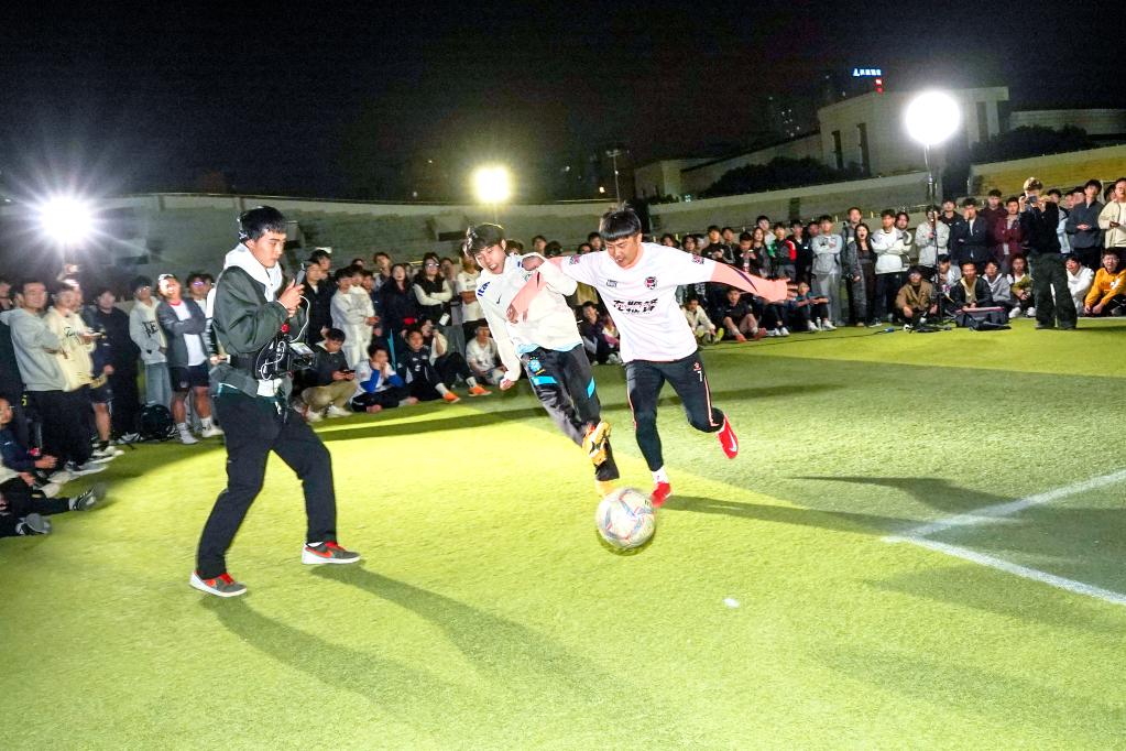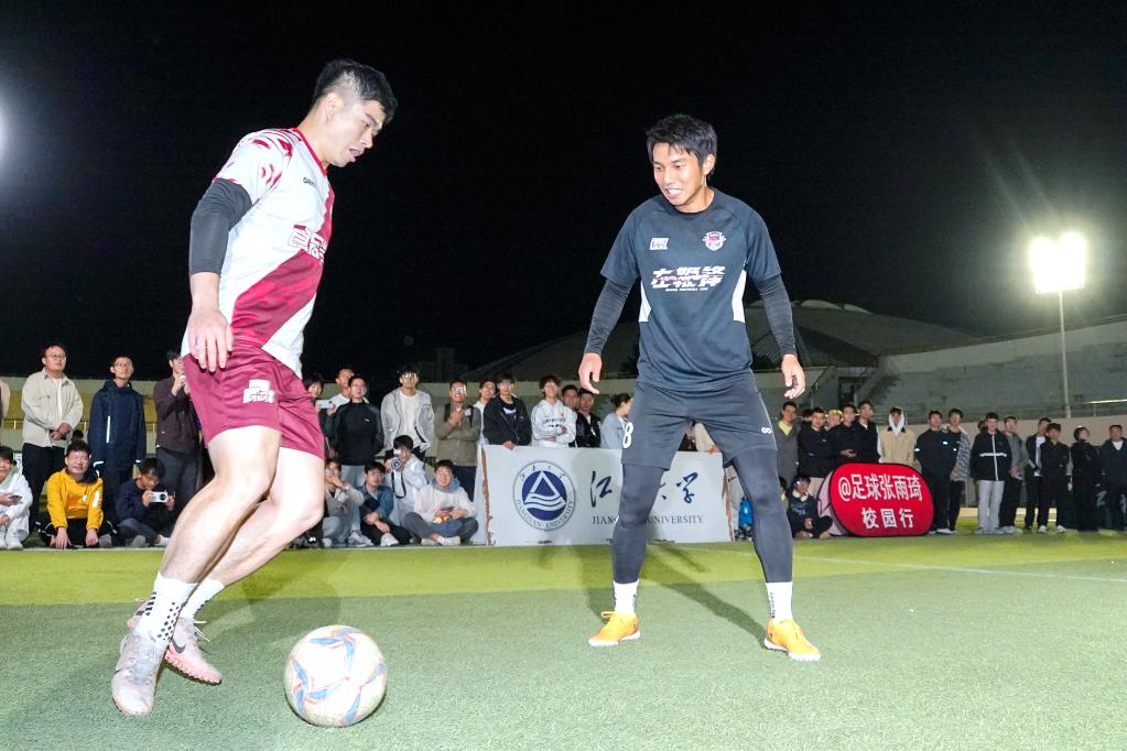 随后,张雨琦与卢则灵、李皓然、陈立群在体育中心,正式开展江南大学2025“足球达人进校园”活动。首先是同学与嘉宾展开1对1足球过人王表演赛,不乏技术出众,凭借精湛球技战胜对手,濮宇尘老师、校女足队员也上场过招,现场喝彩如潮、气氛热烈,充分诠释足球的魅力;紧接着,张雨琦与“苏超”球员们同台切磋,让同学们近距离领略到“黄金左脚”的威力、无锡金靴李皓然的精准射术、卢则灵闪电般的冲刺速度,以及陈立群“叹息之墙”般的防守压迫感。在最后的射门测速环节中,同学们踊跃参与测试,三位职业球员也现场展示了令人惊叹的专业实力。