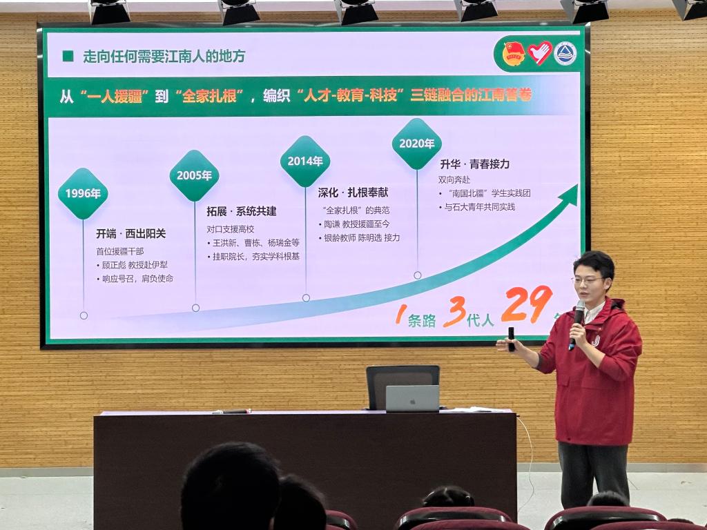 第25届研究生支教团成员张旭航带来“昆仑山下育新苗”主题宣讲。结合在新疆于田的支教日常,他描述了塔克拉玛干沙漠的环境、胡杨精神带来的教育感悟,讲述了从基础音标教起、助力学生英语成绩显著提升的奋斗故事,以及“星星远望”等活动搭建的文化桥梁,让同学们对西部教育有了更直观的认知。