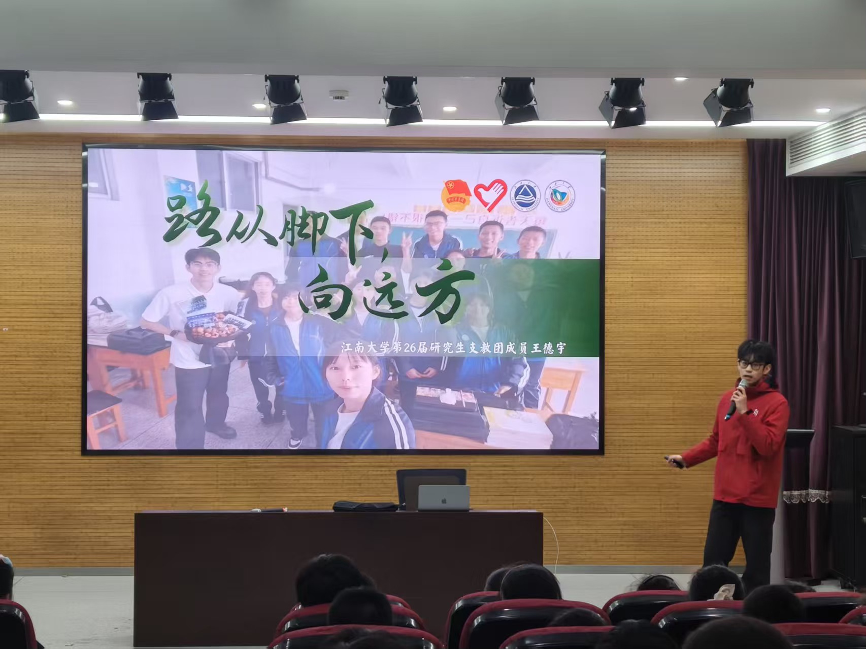 活动伊始,第26届研究生支教团成员王德宇以“路从脚下,向远方”为主题,分享了在云南龙陵的支教经历。他讲述了山区学子翻山越岭的求学日常、学生们从“读书无用”的误区转向坚定追梦的思想转变,还分享了篝火晚会“抹黑脸”送祝福、荔枝花束寄离别的暖心场景,让现场师生深切感受到支教路上的坚守与温情。