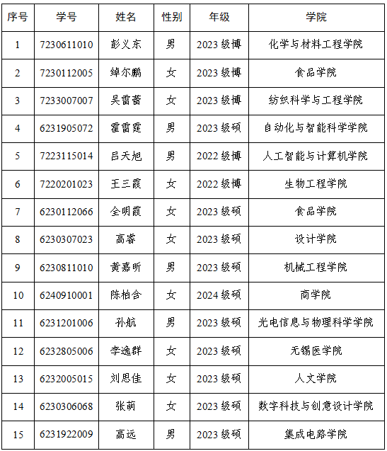 江南大学第二十一届“十佳研究生”入围最终评选名单
