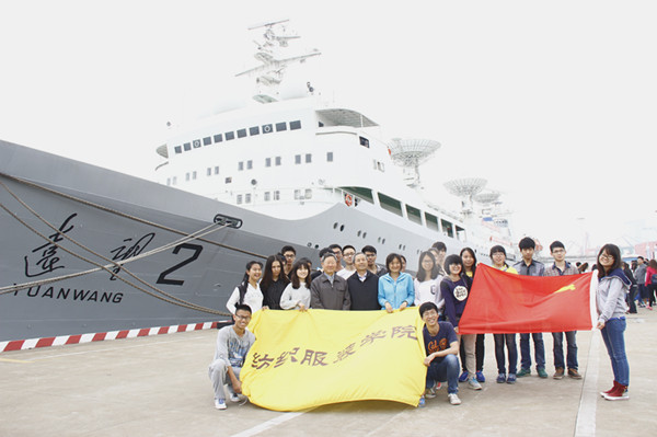 5月9号上午,我校纺织服装学院轻化1301、轻化1401与纺织1405团支部的同学们,在纺院关工委刘志远老师与远望号基地原副司令员、总工程师刘仁生同志的带领下,一同前往江苏省江阴市“远望”基地,参观了“远望号”二号测量船。