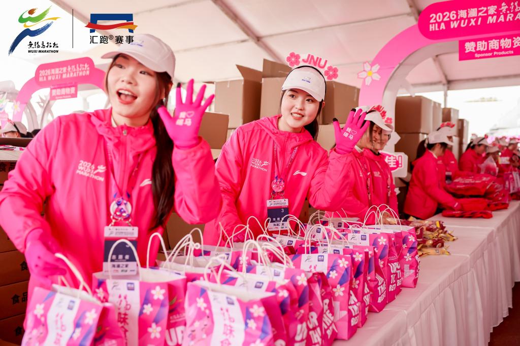 随着发令枪响,跑者逐风前行,“江南小彩虹”的身影成为赛道上最亮眼的粉色风景。起点组志愿者筑起人墙,以热情引导与温暖笑容迎接八方跑者;补给组志愿者步履不停,备水、浸湿海绵、分发水果,为跑者注入满满能量;医疗组志愿者严阵以待,以专业能力守护跑者安全,成为赛道上的“生命防线”。樱花轻扬,春风拂面,志愿者的专业服务与跑者的拼搏姿态相映成趣,共同绘就锡马独有的春日画卷。