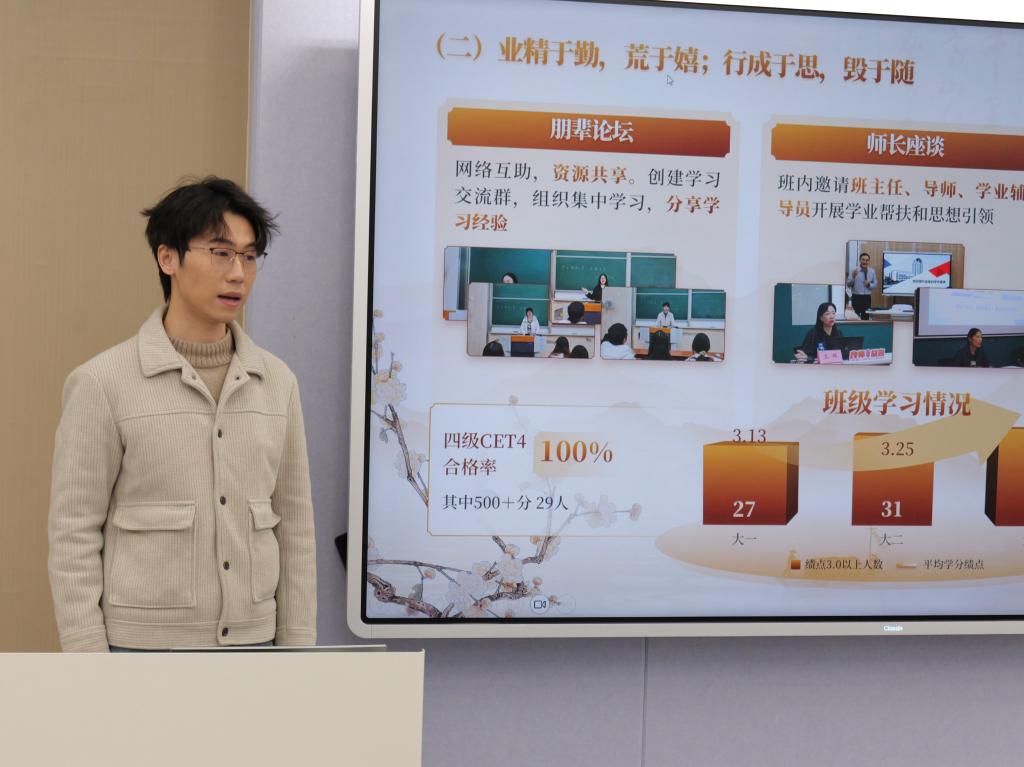 在支部建设分享环节,汉师2203班长岳腾翔分享了团支部在组织建设、理论学习与社会实践方面的经验与成效,小教2304团支部书记王阳汇报了团支部在思想引领、专业学习、特色活动等方面开展的扎实工作和取得的成长进步。结合习近平总书记致中国志愿服务联合会第三届会员代表大会的贺信,团支部同学分享了对“奉献”与“志愿精神”的深刻理解,展现了新时代师范生的责任担当。