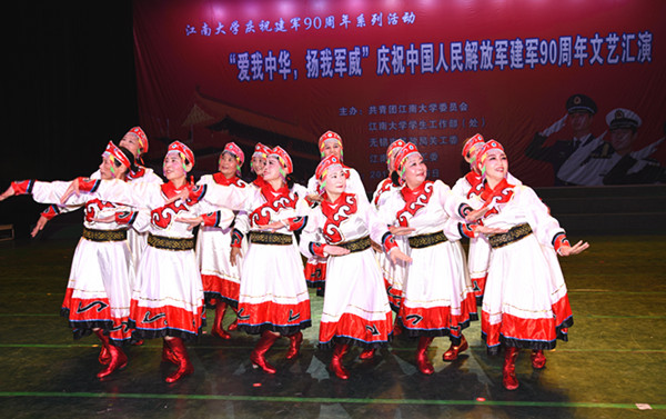 优美的旋律,雀跃的欢呼,在全场热烈的掌声中,江南大学副校长吴正国上台致辞。他强调军民同心、开创未来的重要性,呼吁江南学子为国家的繁荣富强贡献力量,勇担中华民族伟大复兴的重担,同时感谢民政局军休中心退伍军人、江南大学离退休老师和我校艺术团学生为演出所付出的努力。文艺汇演在民政局关工委退伍军人时而铿锵时而柔美的群舞《映山红》中拉开了序幕。汇演节目精彩纷呈,异域风情与爱国情怀相融合,昆剧经典与现代时尚相碰撞,或刚健或柔美的舞蹈,或激情或婉转的歌声。退伍老兵凭借着激昂的热情和满腔热血奏响了激情四射的爱国篇章,青年学生依托时尚的元素和年轻活力演绎了朝气蓬勃的青春乐章。愉快的时光总是如此短暂,文艺汇演在大合唱《共筑中国梦》中落下帷幕。